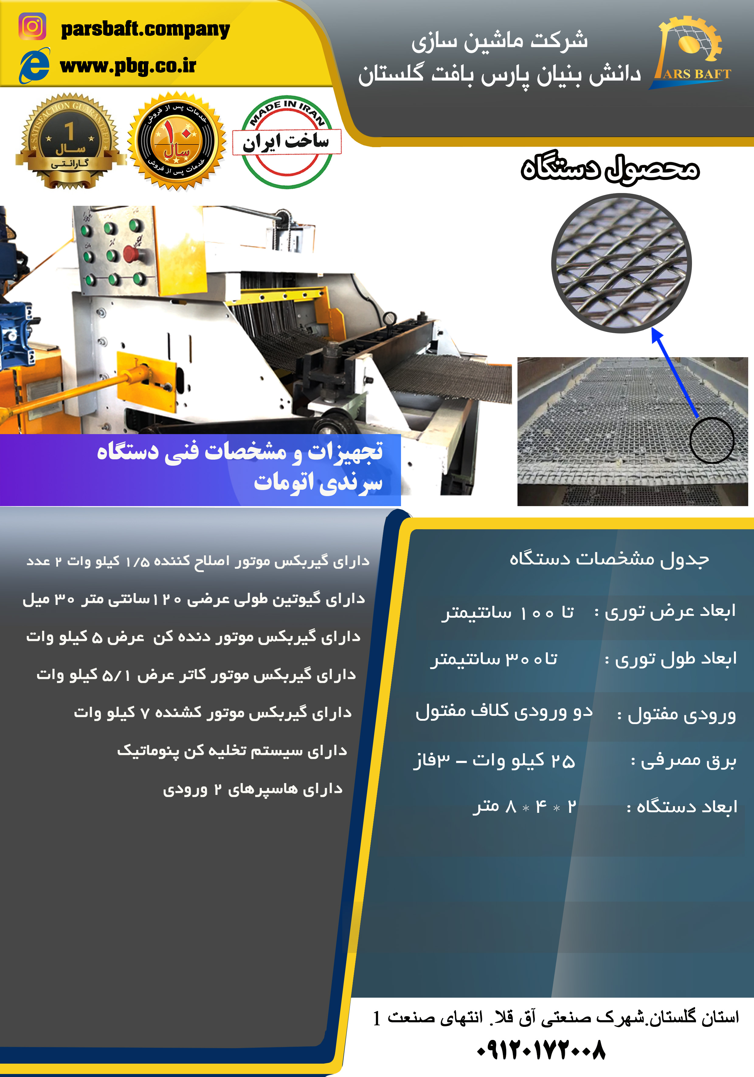 مجموعه ماشین‌سازی دانش‌بنیان پارس بافت گلستان با تمرکز بر طراحی و ساخت تجهیزات صنعتی حوزه مفتول و توری، دستگاه سرندی اتوماتیک را با رویکرد مهندسی و صنعتی توسعه داده است.